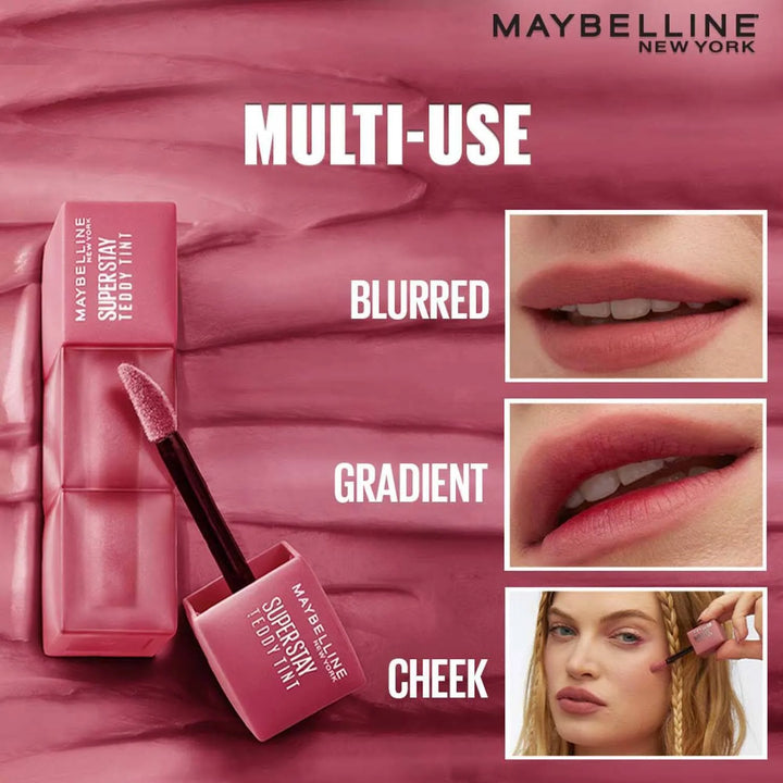 Super Stay Teddy Tint lasts for up to 12 hours. No transfer. In 10 buildable shades.Wear it sheer, blurred, bold or even on cheeks.